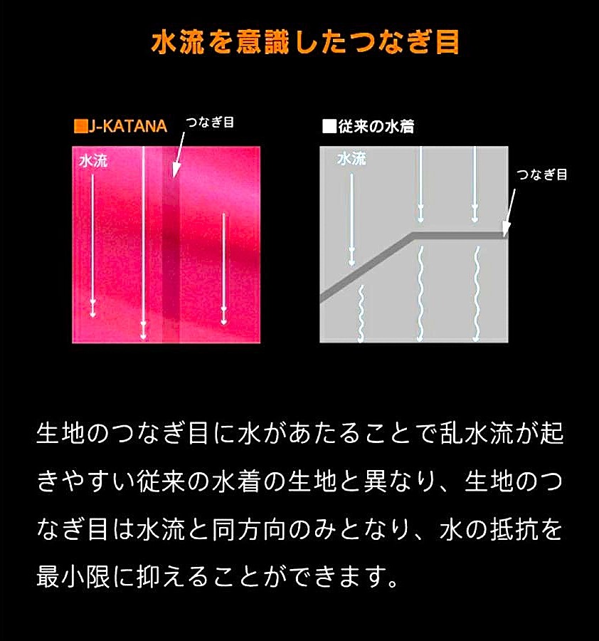今回試着できる水着は「J-KATANA OWS」というOWS用の水着で、生地のつなぎ目を水流と同方向のみとして、水の抵抗を最小限に抑えることを実現した 最新モデルの水着です。