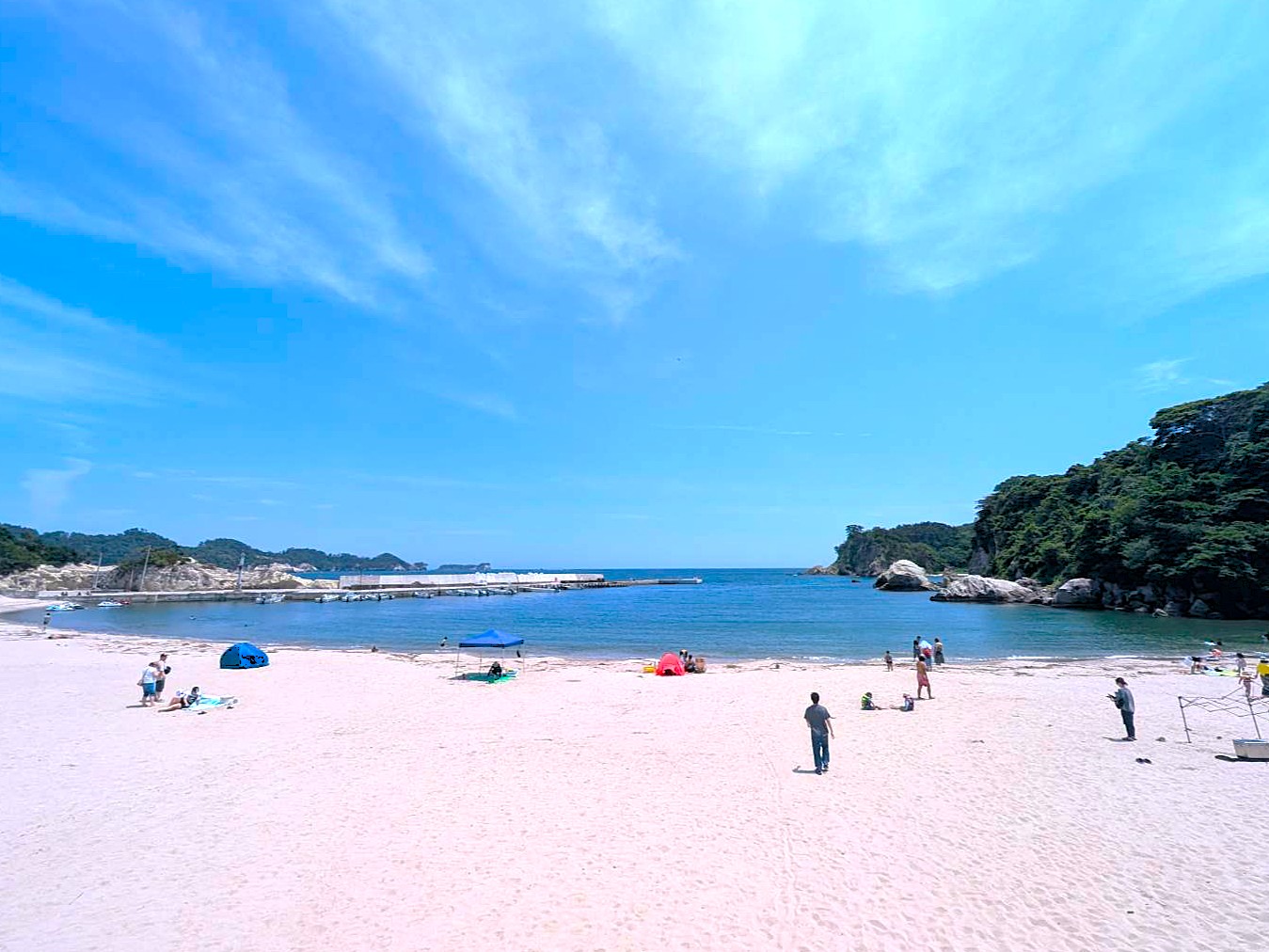 手付かずの自然の中にゆったりと穏やかに広がる月浜海水浴場は、その名の通り、きれいな三日月形をした美しい白砂の海岸。