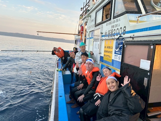 佐渡海峡横断泳の船上にて、メンバーたちと