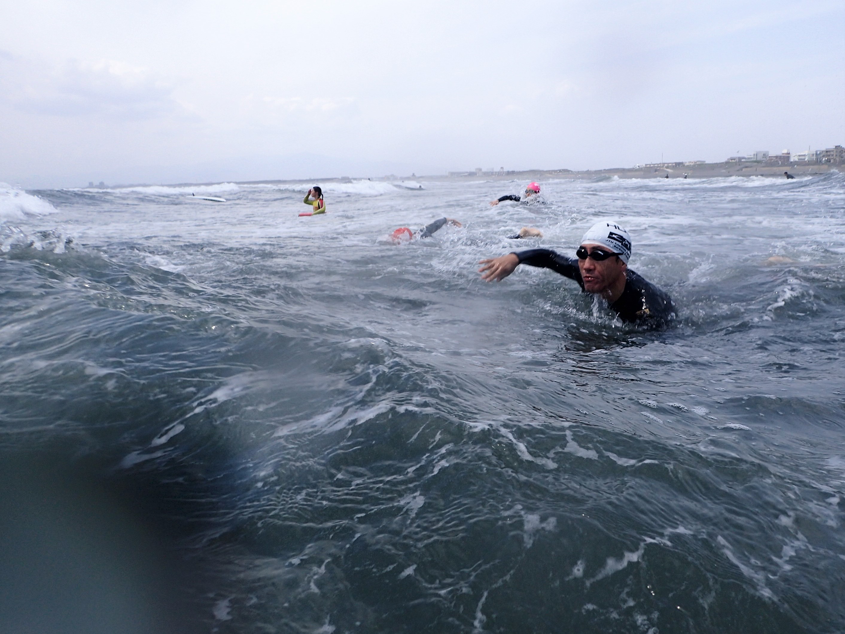 ライフセーバーも「こんな荒れた海で、ガードをするのは初めてです」というようなコンディションでしたが、こんな海は滅多に泳げません。せっかくですから、足の立つ範囲で時間を45分間に短縮して、みんなで泳ぎました。