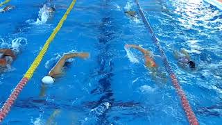 先ずは片手クロールで掻く手だけパドルをつけて、その後は掻かない方の手をビート板に乗せて片手クロールをしました。ストロークはキャッチしてから水を溜めてきて胸の下あたりから後ろに押すタイミングが一番推進力が出るところ。そのタイミングに合わせて反対の手を前に伸ばせると効率よく進めるのです。