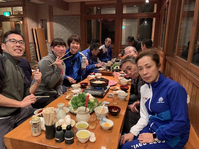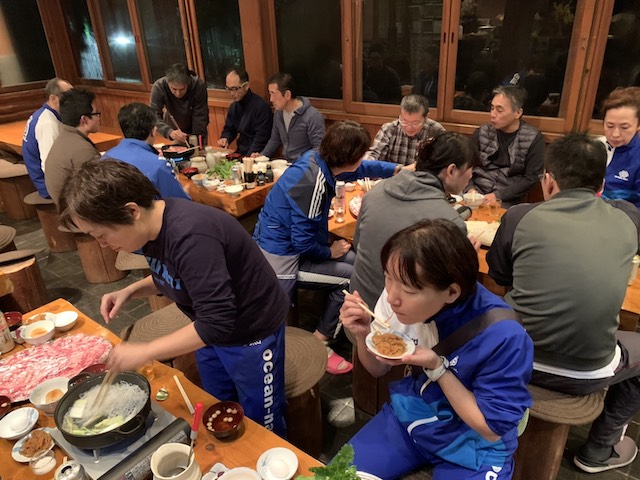 夕食は沢山のお肉と野菜で美味しいしゃぶしゃぶを堪能。その後には懇親会と、水泳談義に華が咲きました。