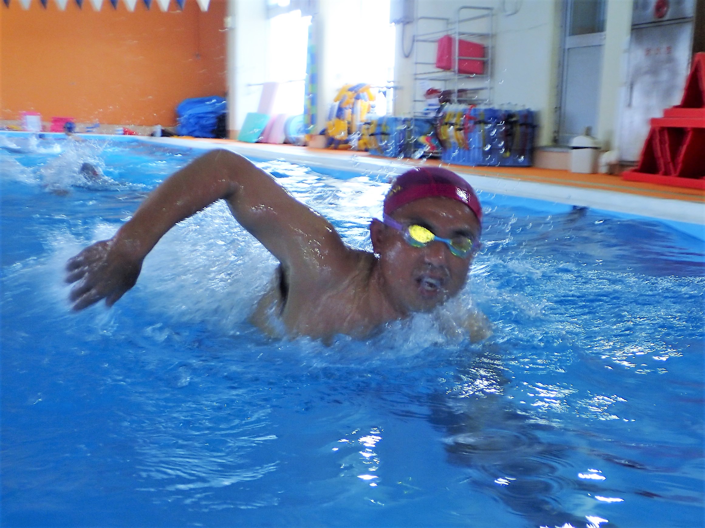 そしたら、レースの途中でだんだん顔を前に上げられなくなってきて、ヘッドアップをしても高さが足りず、しまいには何度も水を飲んでしまう羽目に…。