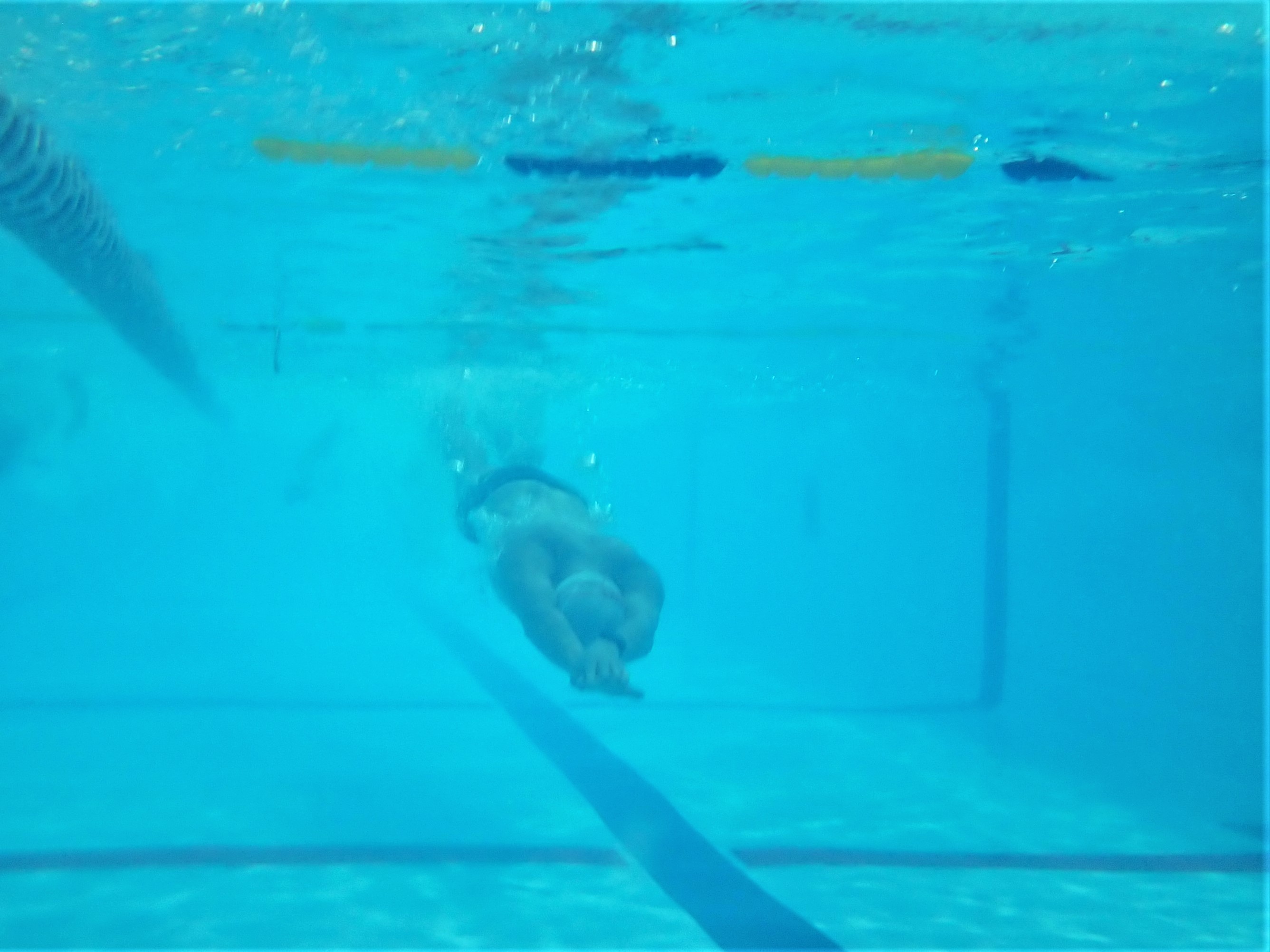 このメニューをやる前に説明をしましたが、潜るときは両手を下にして気をつけの姿勢を取るのではなく、腕を前に伸ばして潜ると、抵抗が少なく浮いてきた後のスイムにも移行しやすいですよ。