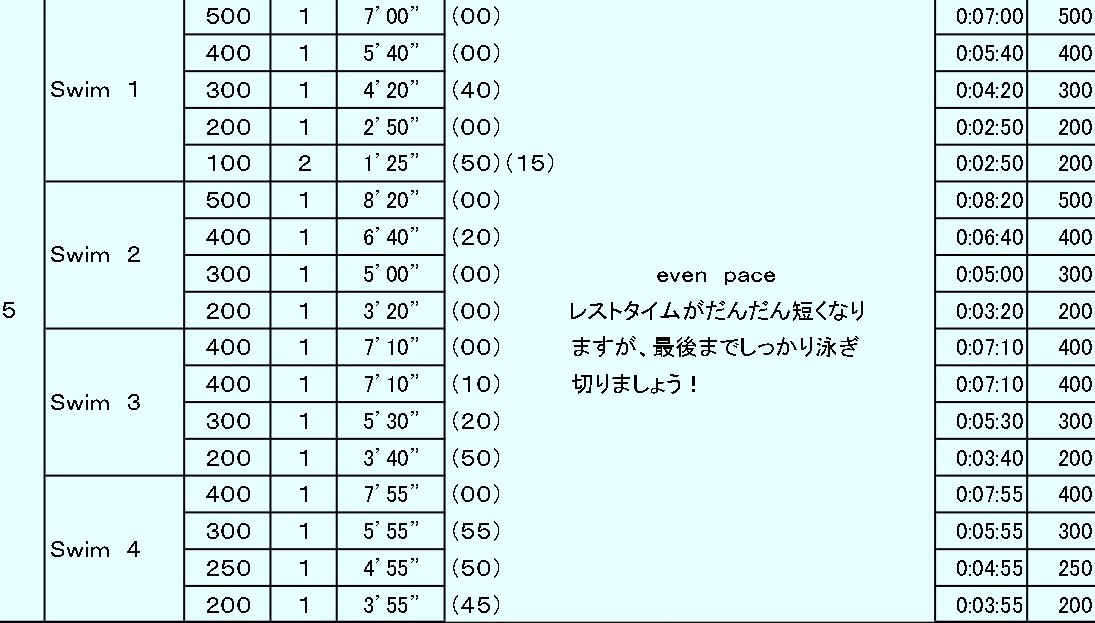 先週と今日の新代田のメインメニューは、1本ずつ泳距離を変えていって、ロングに対する抵抗を取っ払うというトレーニングでした。