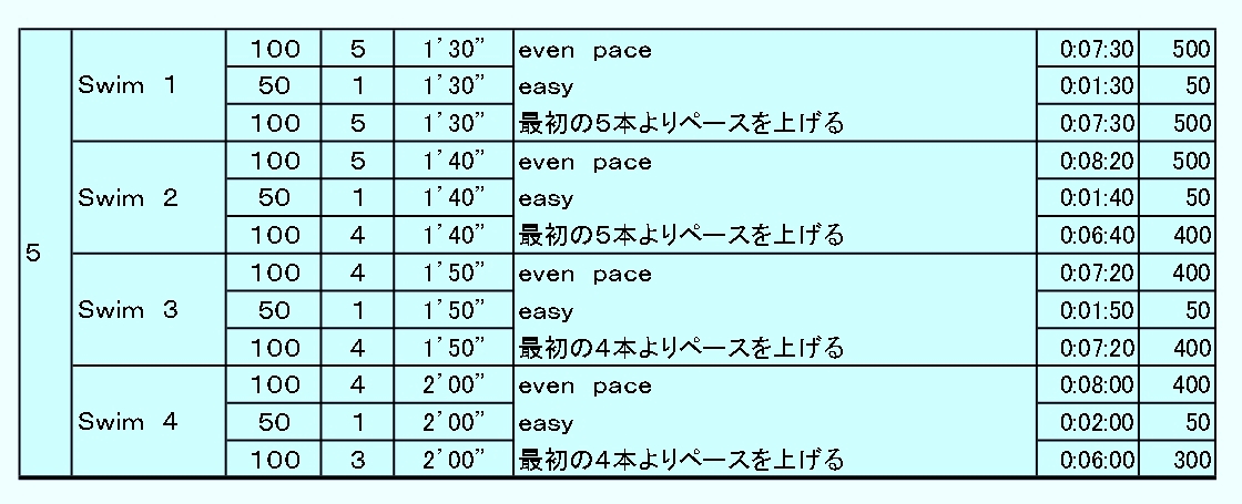 100m×4本 or5本 のスイムメニューを2setだったのですが、2set目は1set目よりスピードを上げて泳ぎます。