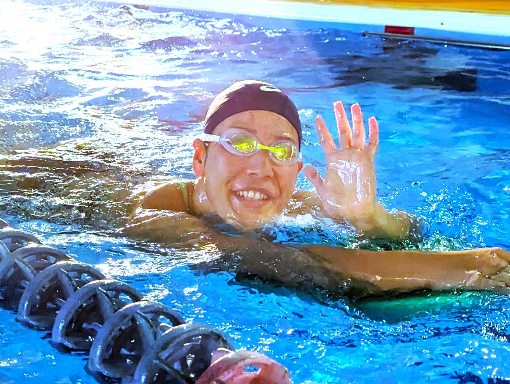 背泳ぎのキックをしながら、笑顔で手を振る光景も!😄