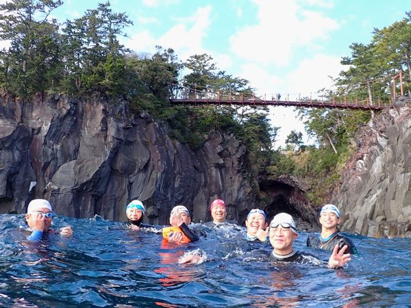 東伊豆の城ヶ崎の吊り橋の下から、パワースポットである「蓮着寺」の沖の俎岩まで、約2.5kmをオーシャンスイム。