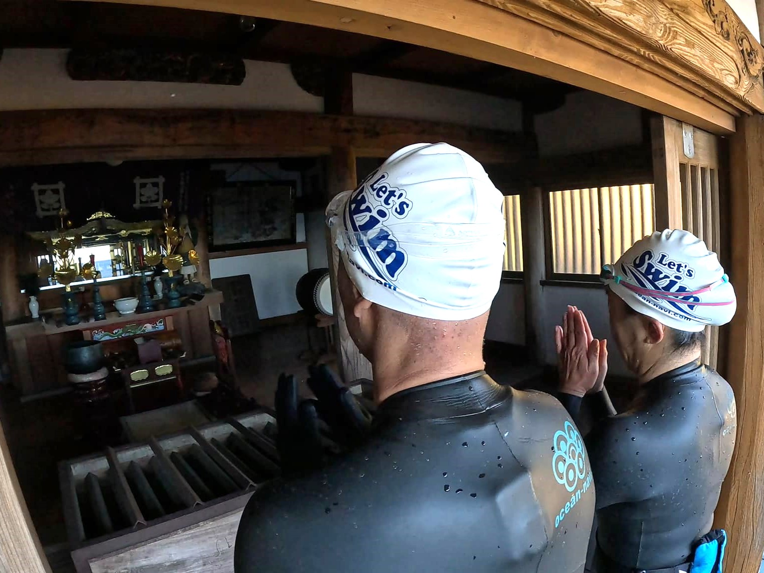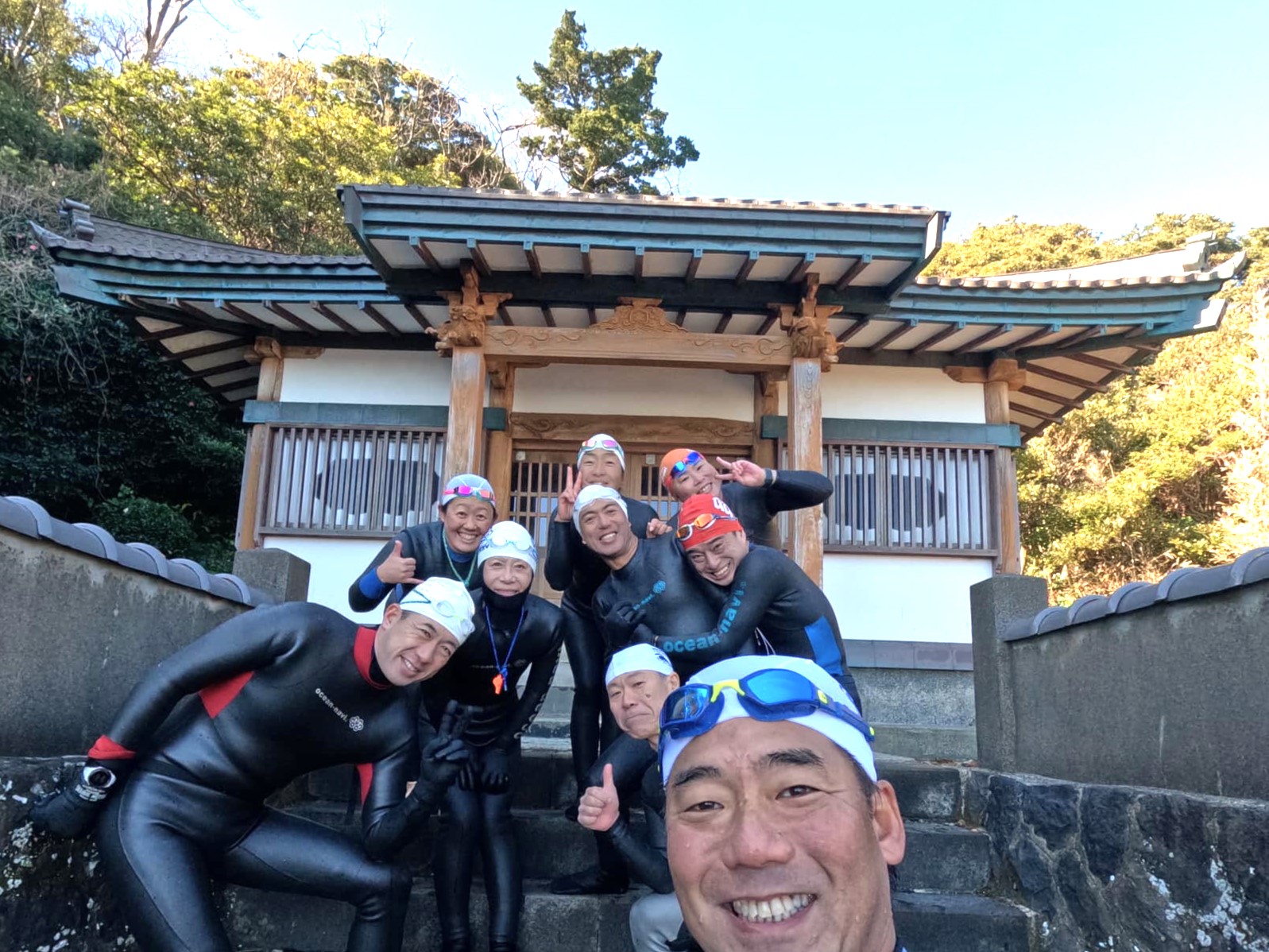 生粋のオーシャンスイマー達9名で、蓮着寺へ上陸し「一年を通じてオーシャンスイムを安全に楽しめますように」と、みんなでしっかり安全を祈願してきてくれました。
