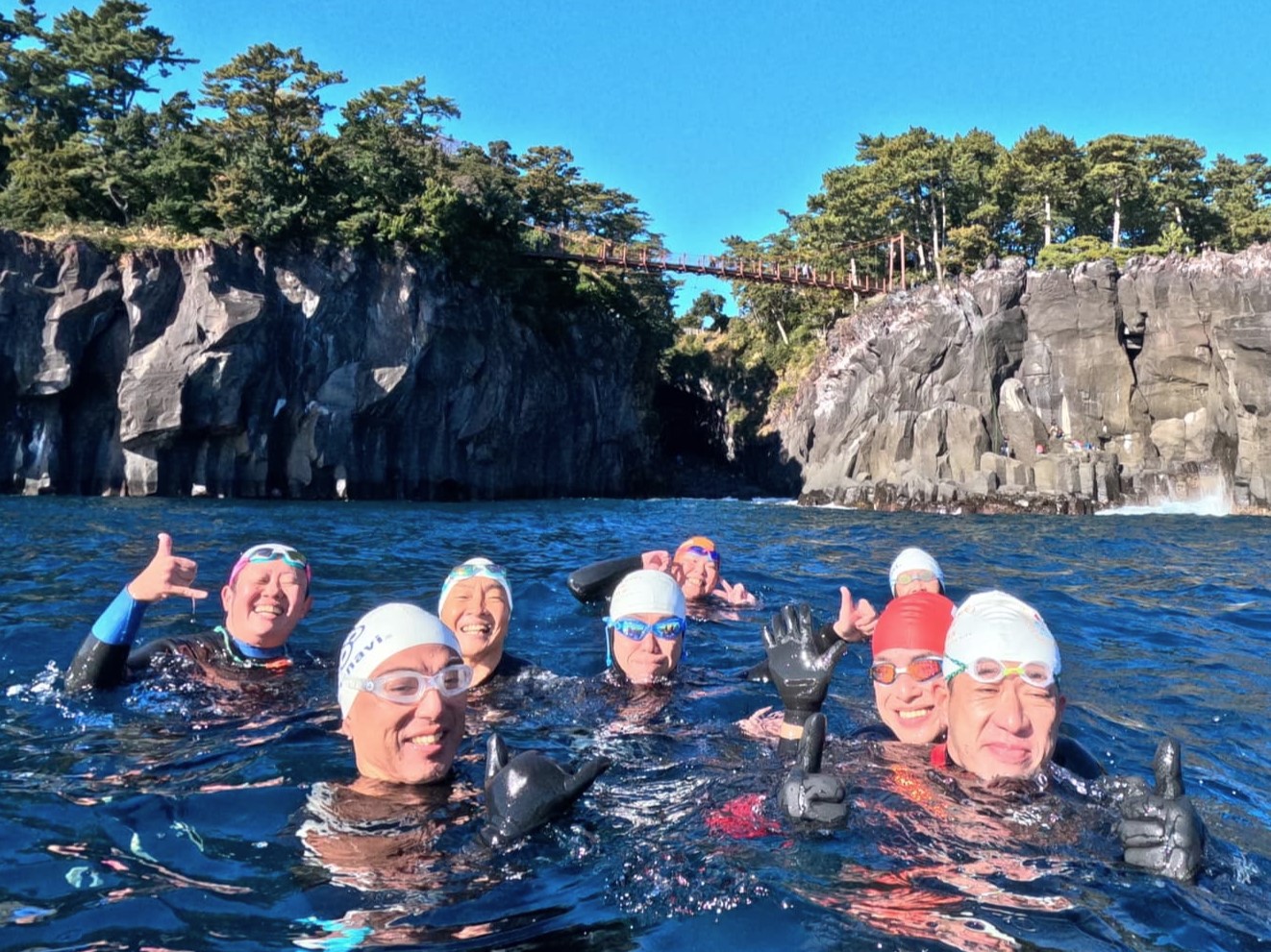 東伊豆の城ヶ崎の吊り橋の下から、パワースポットである「蓮着寺」の沖の俎岩まで、約2.5kmをオーシャンスイム。