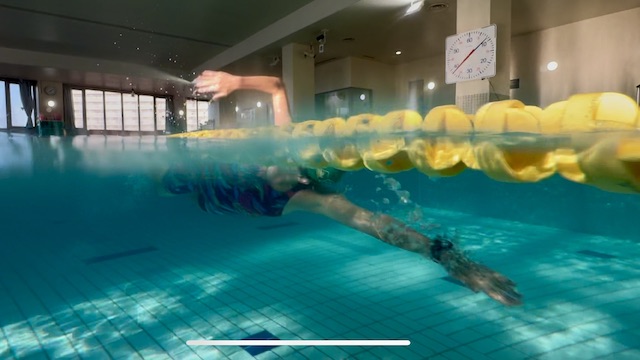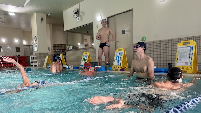 ドリル練習では、泳ぎの基本となる「キャッチからプルにかけての肘立て動作(ハイエルボー)」をじっくり確認。基本を丁寧に振り返ることで、ひと掻きごとに水をとらえる感覚が研ぎ澄まされていくのが実感できたようです。